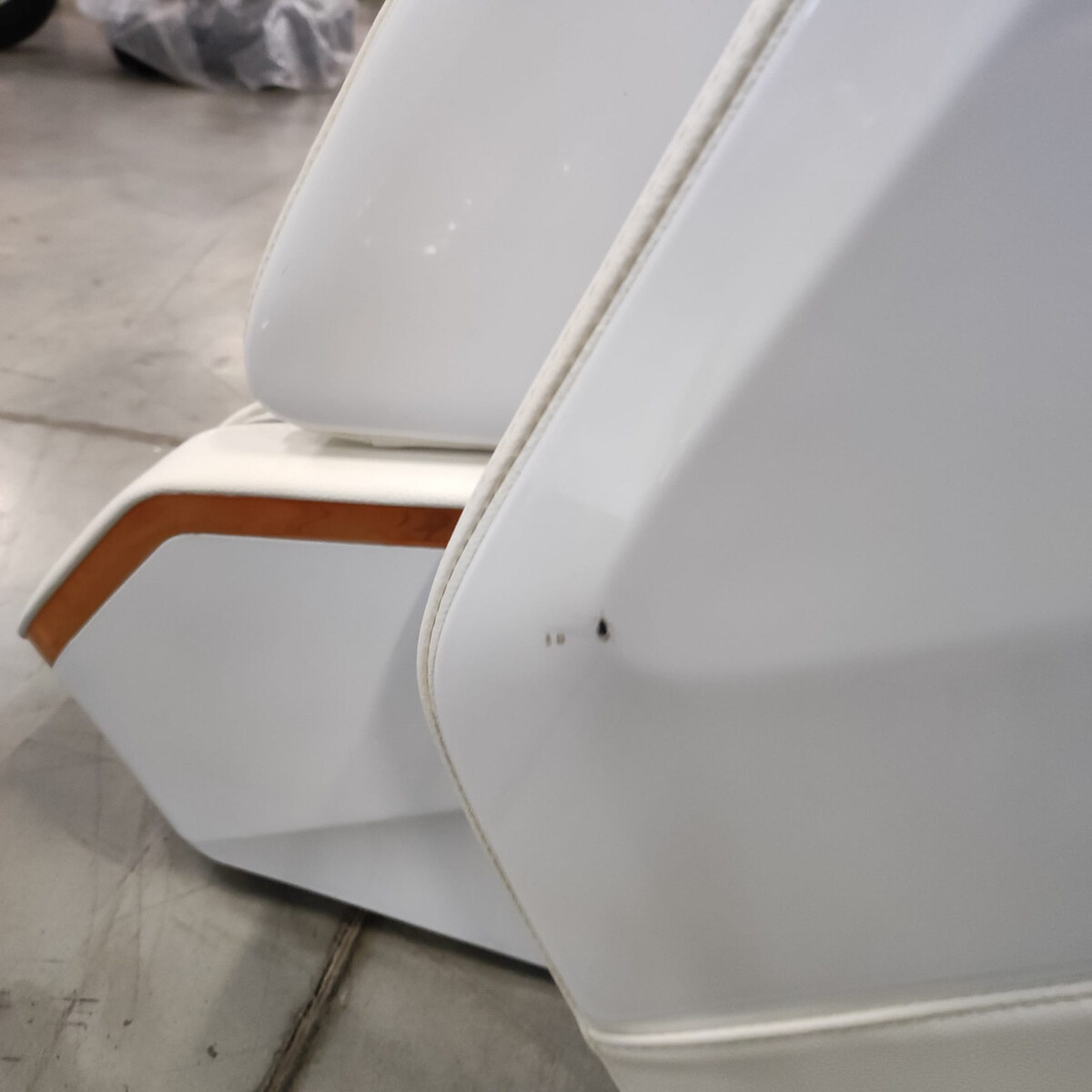 Teljesen működőképes termék hibákkal – a fehér masszázsfotel felületén látható karcolások találhatók.