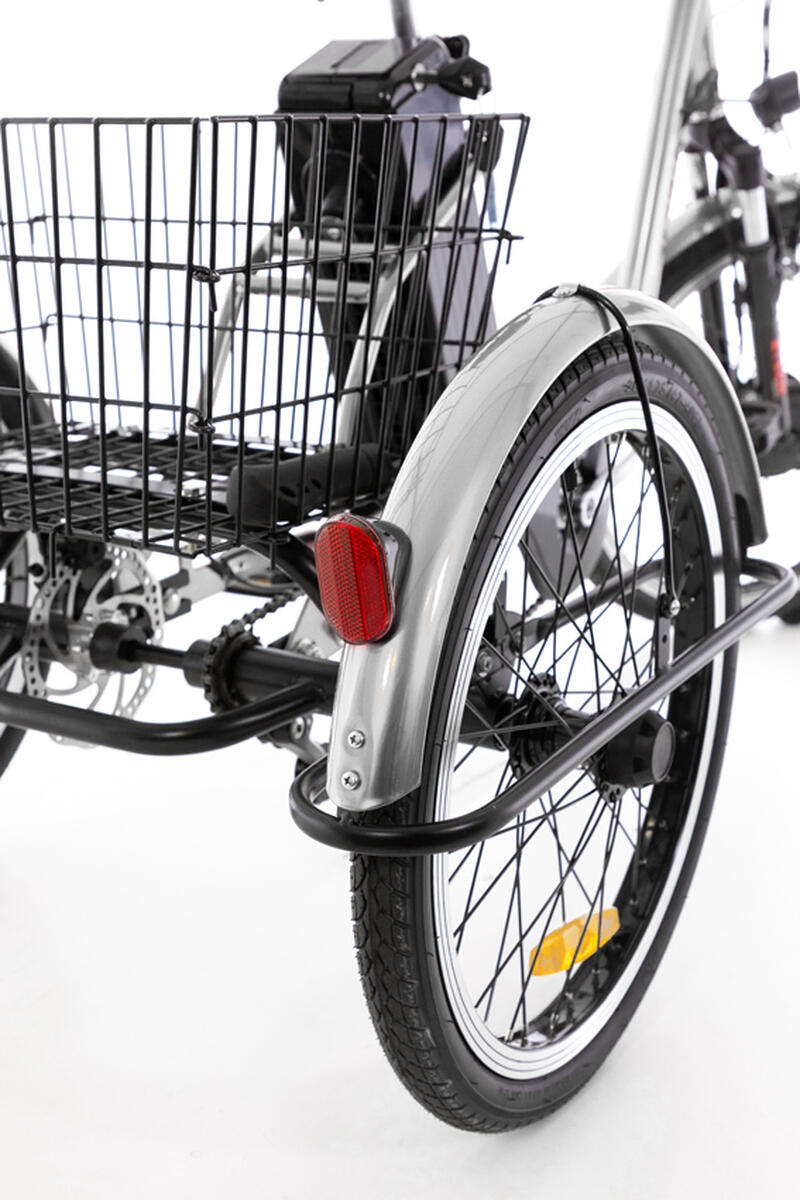 Praktikus és könnyen kezelhető háromkerekű kerékpár időseknek, kiegészítő elektromos meghajtással és tágas tárolóhellyel.