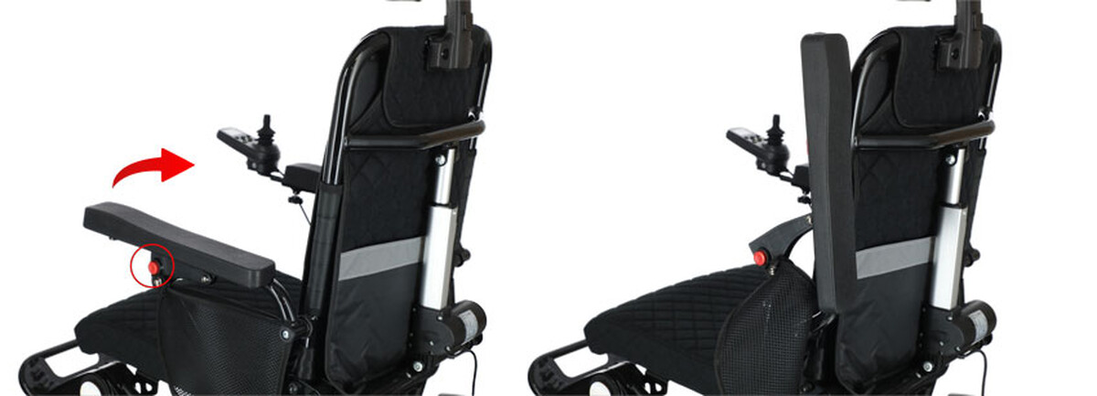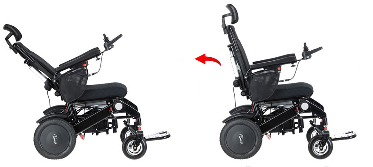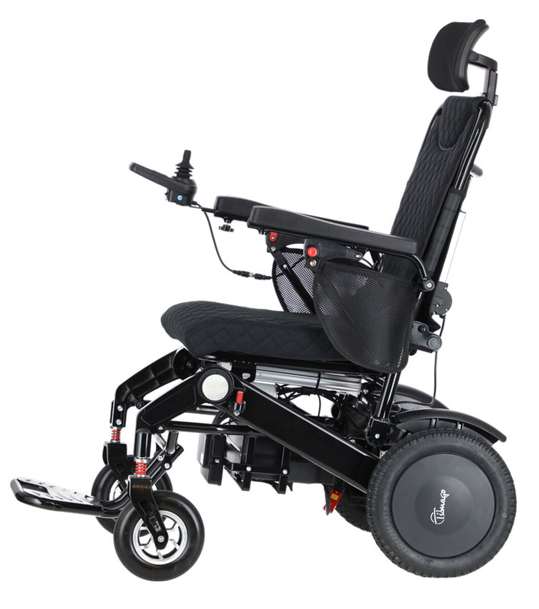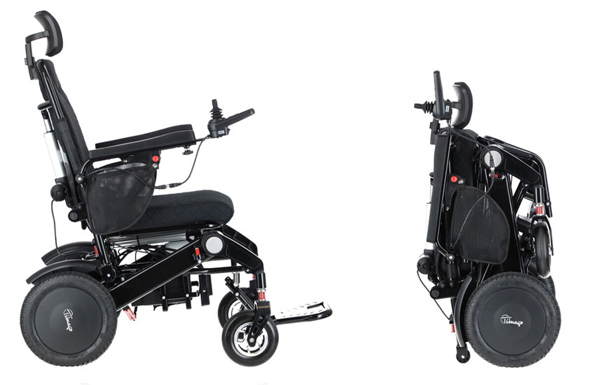 Intelligens elektromos kerekesszék egyedülálló automatikus összecsukó funkcióval és Bluetooth távirányítóval a segítő személy számára.