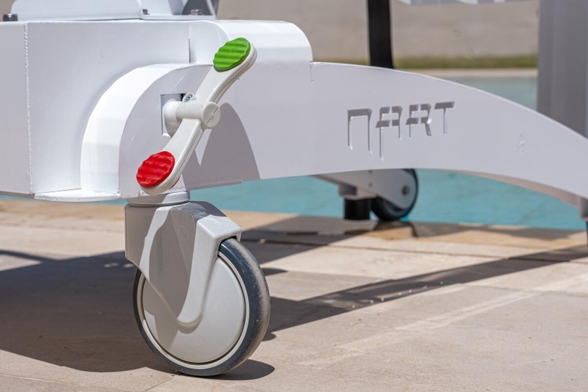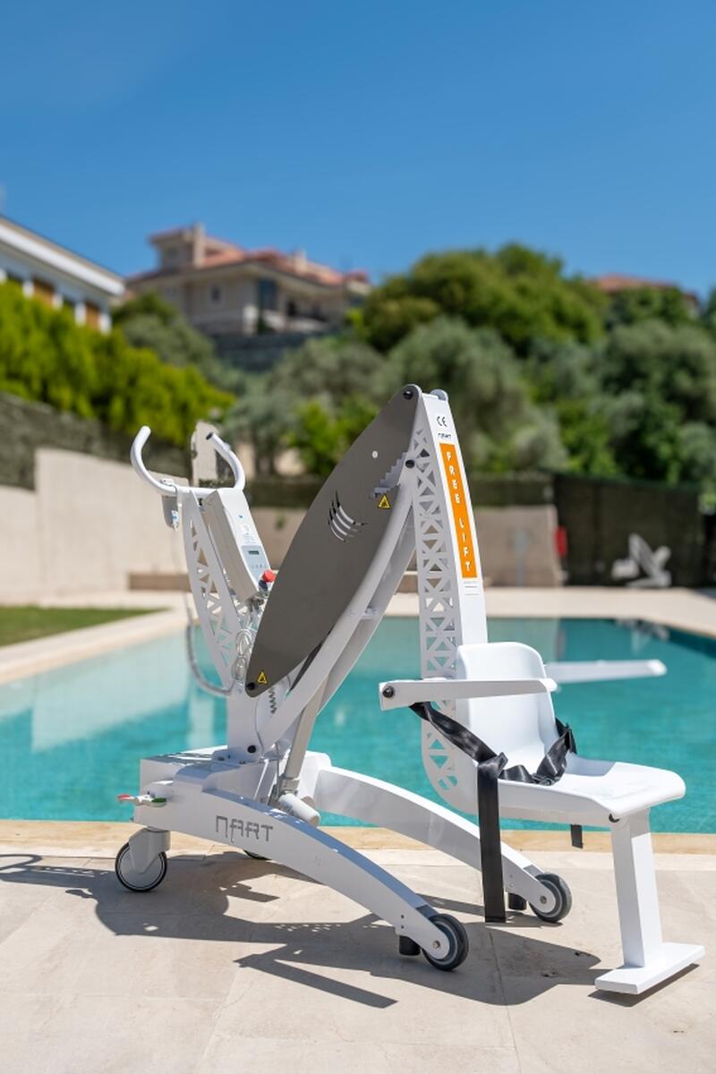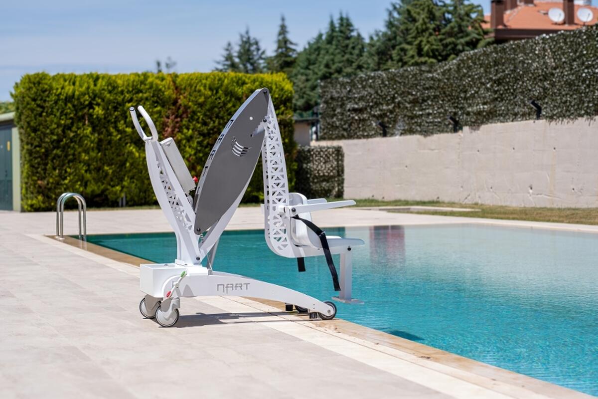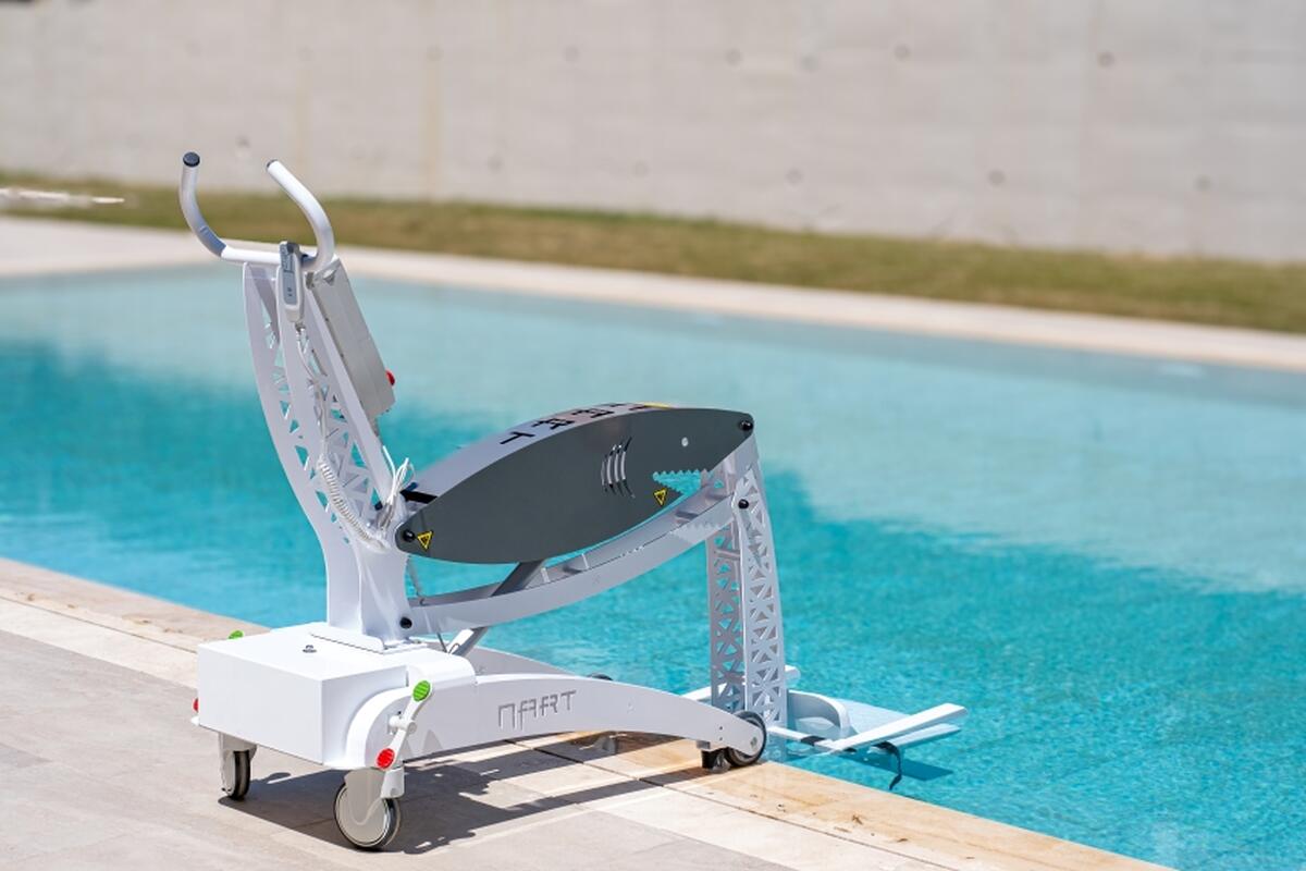 A Nart Shark mobil medenceemelő lehetővé teszi a mozgásukban korlátozott személyek, idősek, valamint rehabilitációs és wellness központok vendégei számára a biztonságos, kényelmes és önálló bejutást a medencébe.