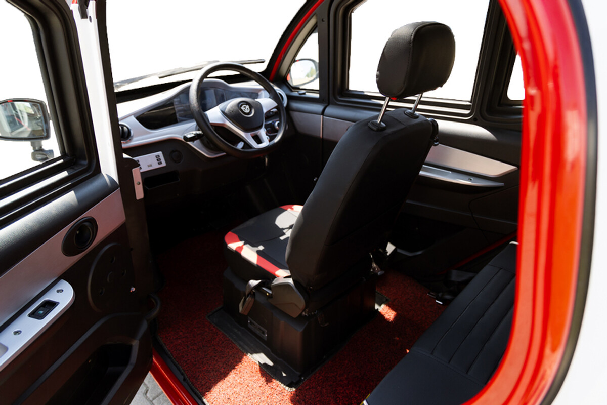 Az UNIZDRAV MiniCar elektromos autó kabinja elegendő helyet biztosít 3 személy számára – a vezetőnek és két utasnak – vagy akár csomagok elhelyezésére is.