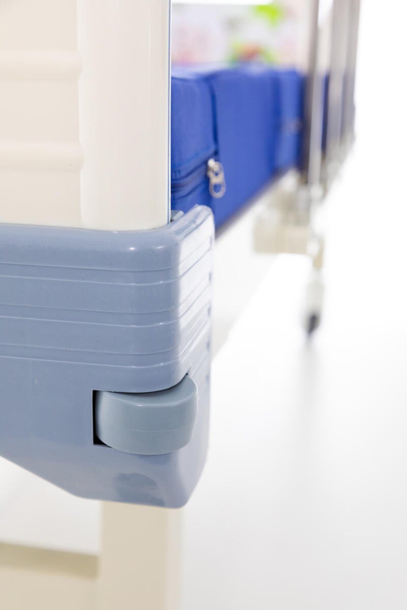 A gyermek kórházi ágy része a levehető műanyag fej- és lábvég, valamint a 40 cm magas, rozsdamentes acélból készült, lehajtható oldalrácsok műanyag borítással, amelyek megóvják a gyermeket a kieséstől, és egyben könnyebb hozzáférést biztosítanak az ápolónak.