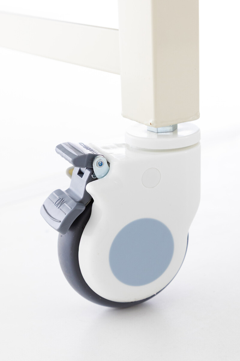 Az ágy szélén ütközést csillapító védőgörgők találhatók, amelyek segítenek az áthelyezéskor fellépő ütközések tompításában, védik a falat és magát az ágyat a sérüléstől. A hagyományos görgők zárral ellátott fékekkel lehetővé teszik az ágy kényelmes és biztonságos mozgatását egyik helyről a másikra.