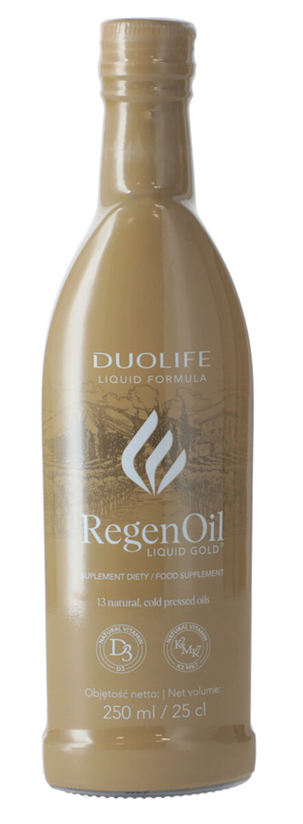 A DUOLIFE RegenOil Liquid Gold egy természetes, folyékony étrend-kiegészítő, amelyet 13 különleges, hidegen sajtolt, finomítatlan növényi olaj egyedi kombinációjából állítottak össze. Ez a kiegyensúlyozott formula természetes forrása az esszenciális telítetlen zsírsavaknak, amelyek elengedhetetlenek a szervezet megfelelő működéséhez. A készítményt továbbá természetes E-vitaminnal egészítették ki (napraforgóolajból), K2-vitamin /MK7 formában/ (fermentált natto-szója erjesztésével készül) és D3-vitaminnal (zuzmóból).