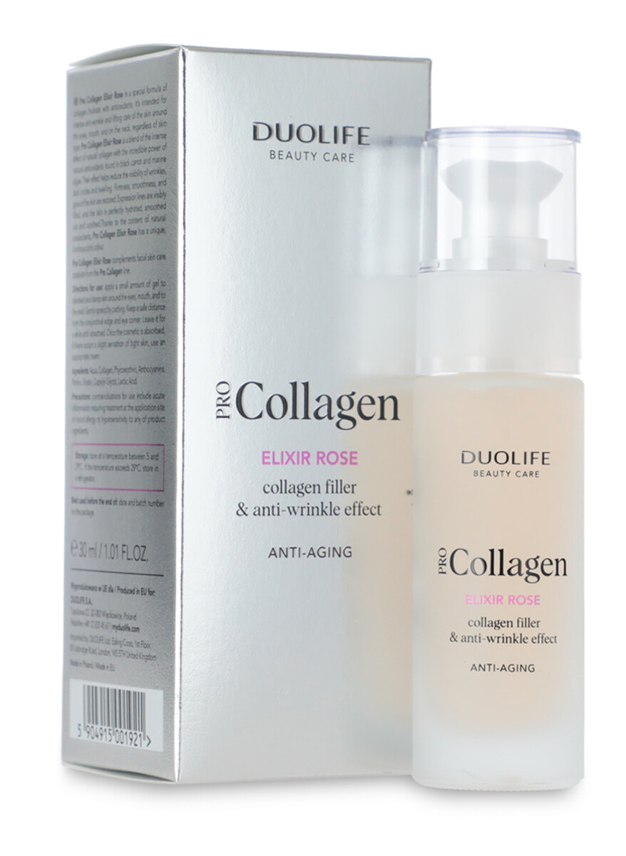 A DUOLIFE Pro Collagen Elixir Rose egy magas koncentrációjú kollagénes hidratáló szérum, amely természetes antioxidánsokkal gazdagított, és kifejezetten az arc legérzékenyebb területeinek intenzív ápolására lett kifejlesztve. A szérum a szem, az ajkak és a nyak körüli bőrre összpontosít, ahol a bőr a legvékonyabb és leginkább hajlamos a mimikai ráncok kialakulására.